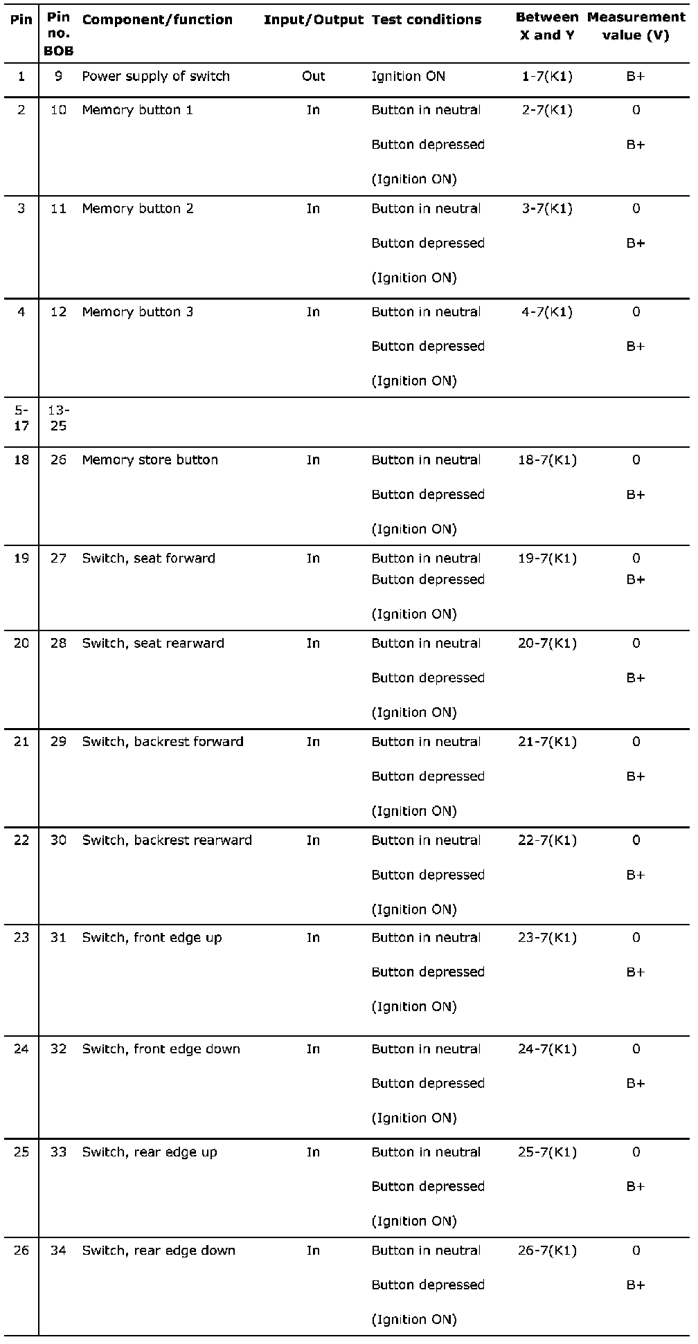Connector 1 (K1), test readings