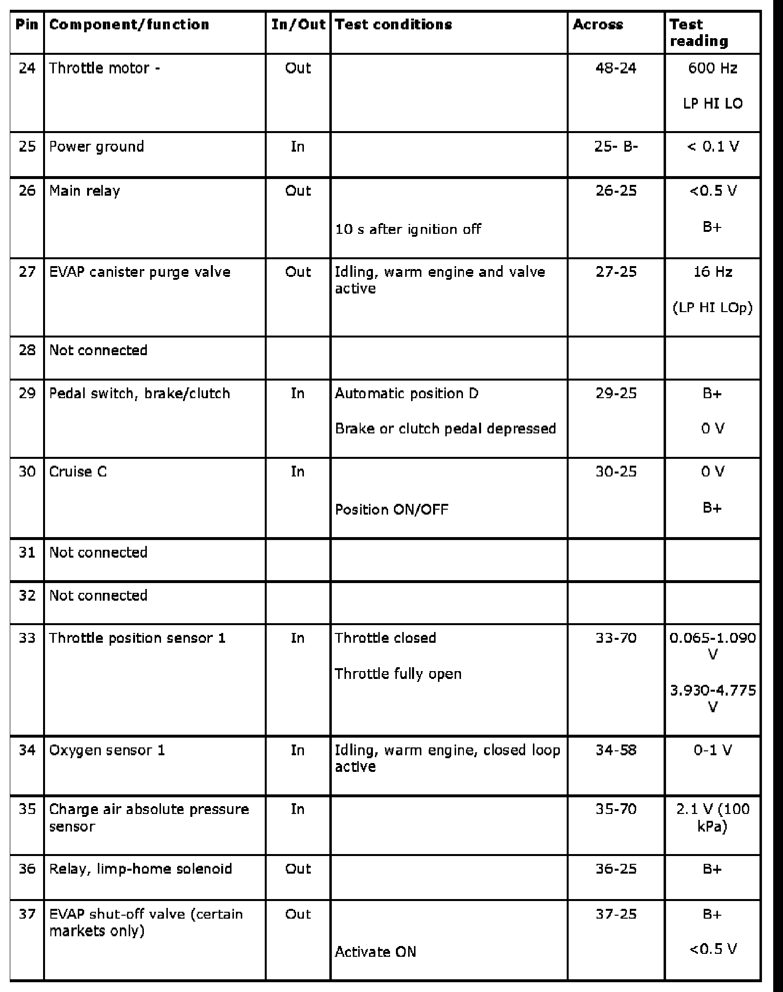 The following tables contain readings and directions for measuring signals and levels on the Trionic control module.