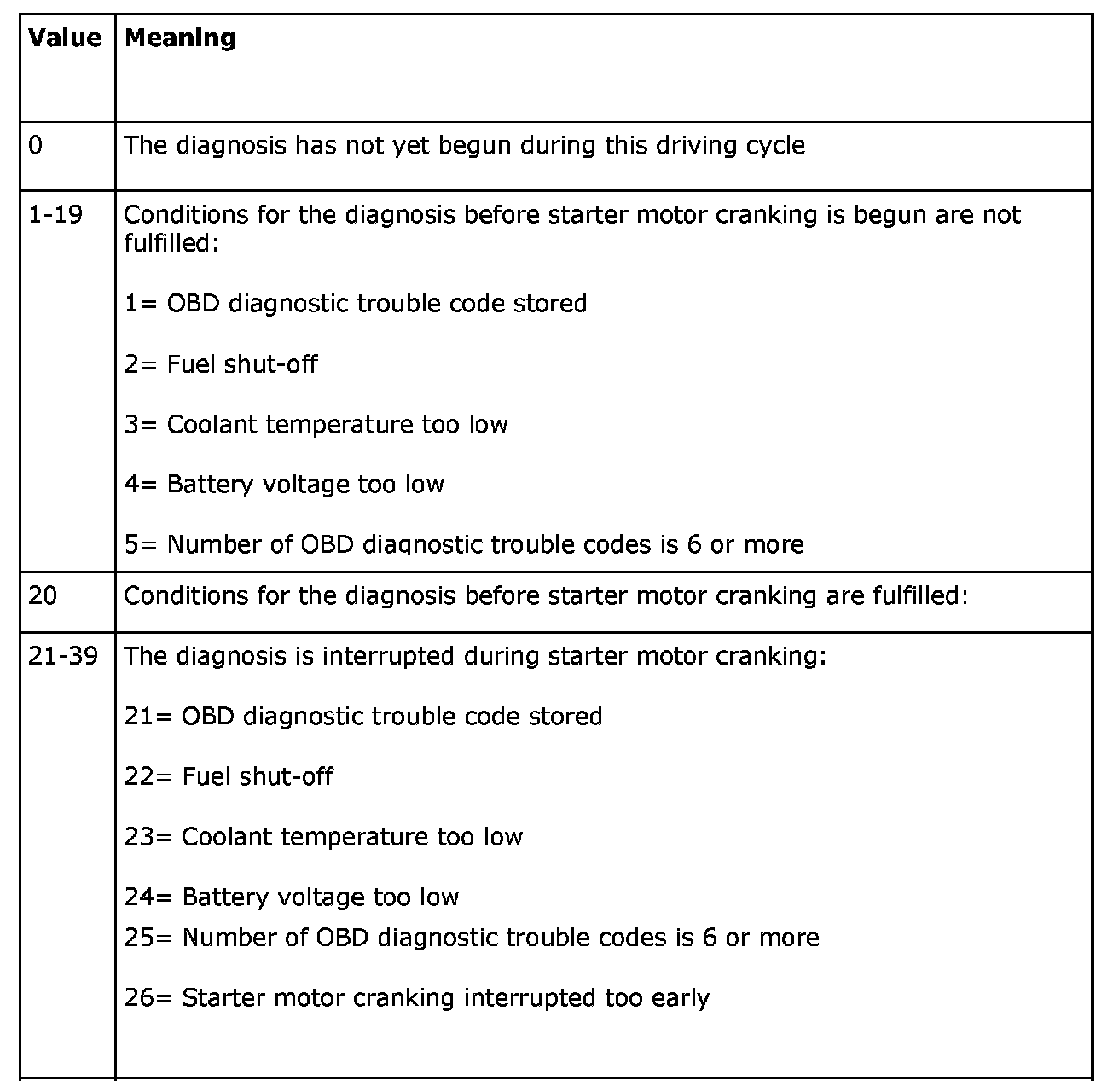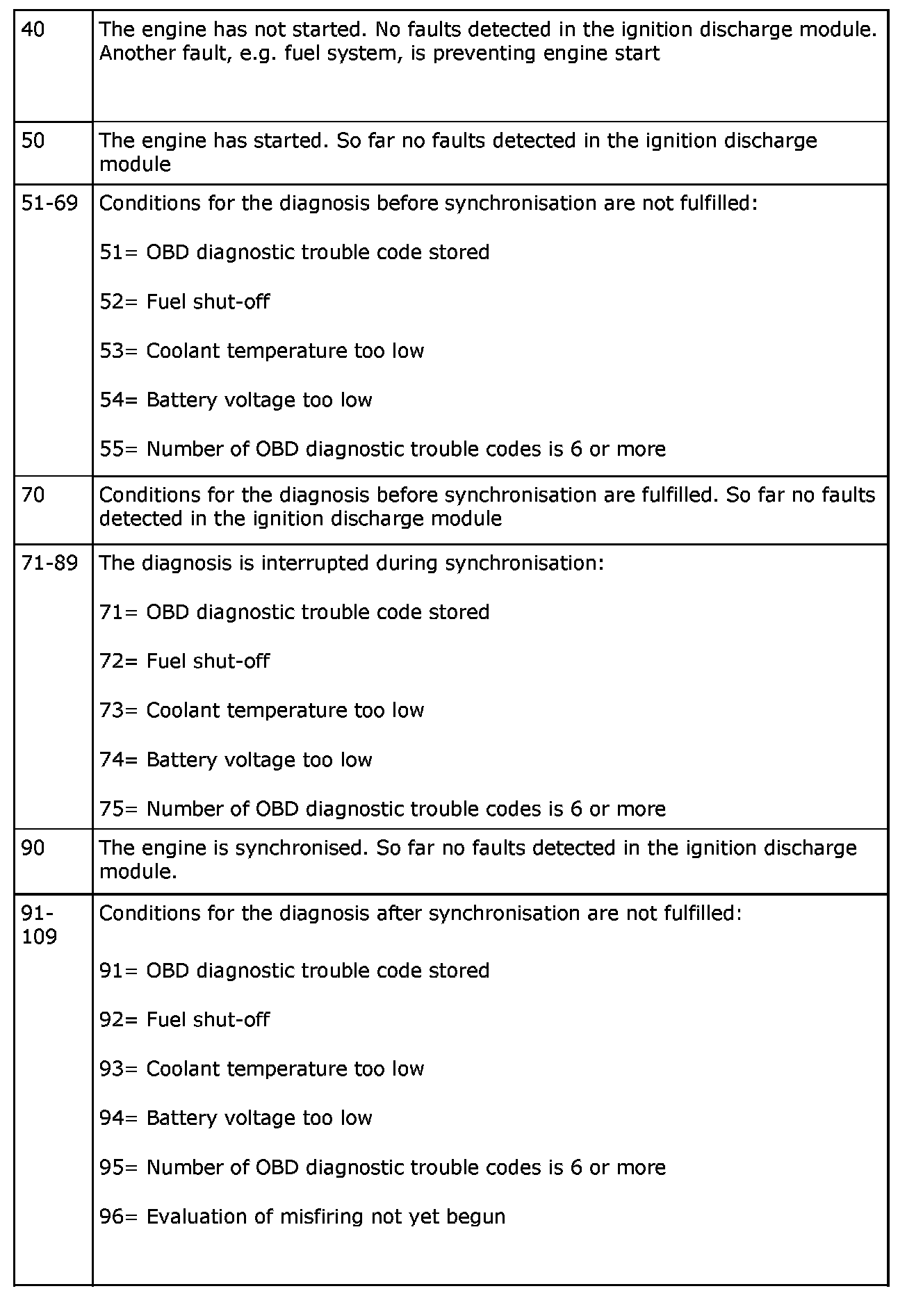 If "Current Status" indicates a value of 131 or greater (fault indication) during driving then the value will be stored as "Failure Status" during 40 heating cycles. "Failure Status" can be seen as a freezing of a fault detected during earlier driving. The function can be compared to fault handling for the normal OBD diagnostic trouble codes.