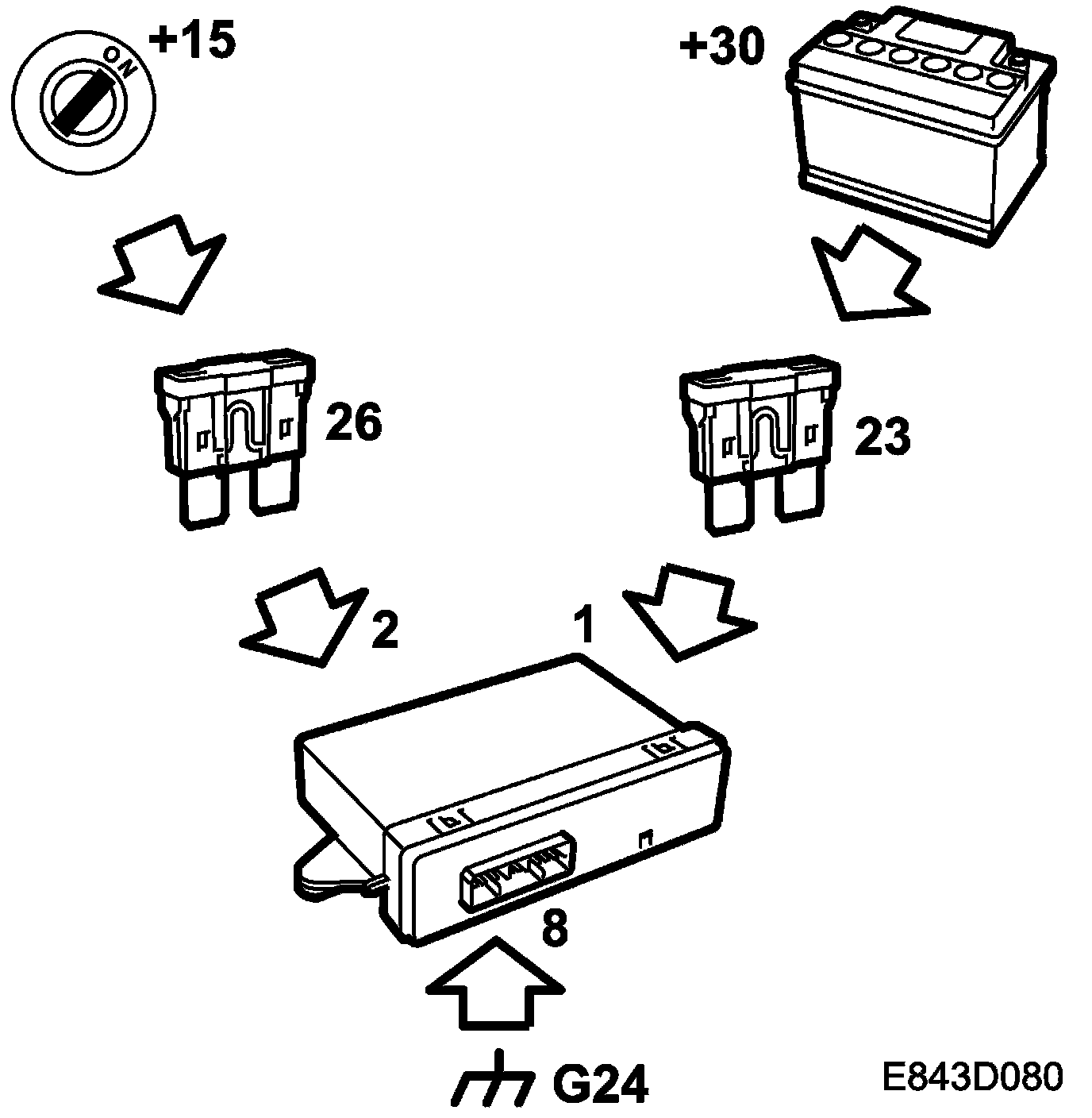 +15 power supply, fed via fuse 26 to control module pin 2.