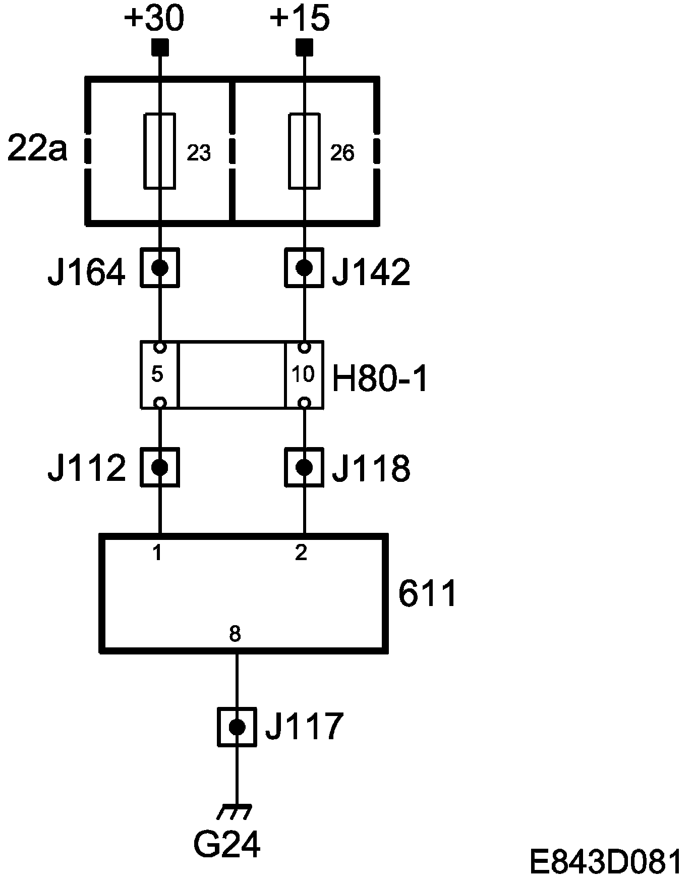 +30 power supply, fed via fuse 23 to control module pin 1.