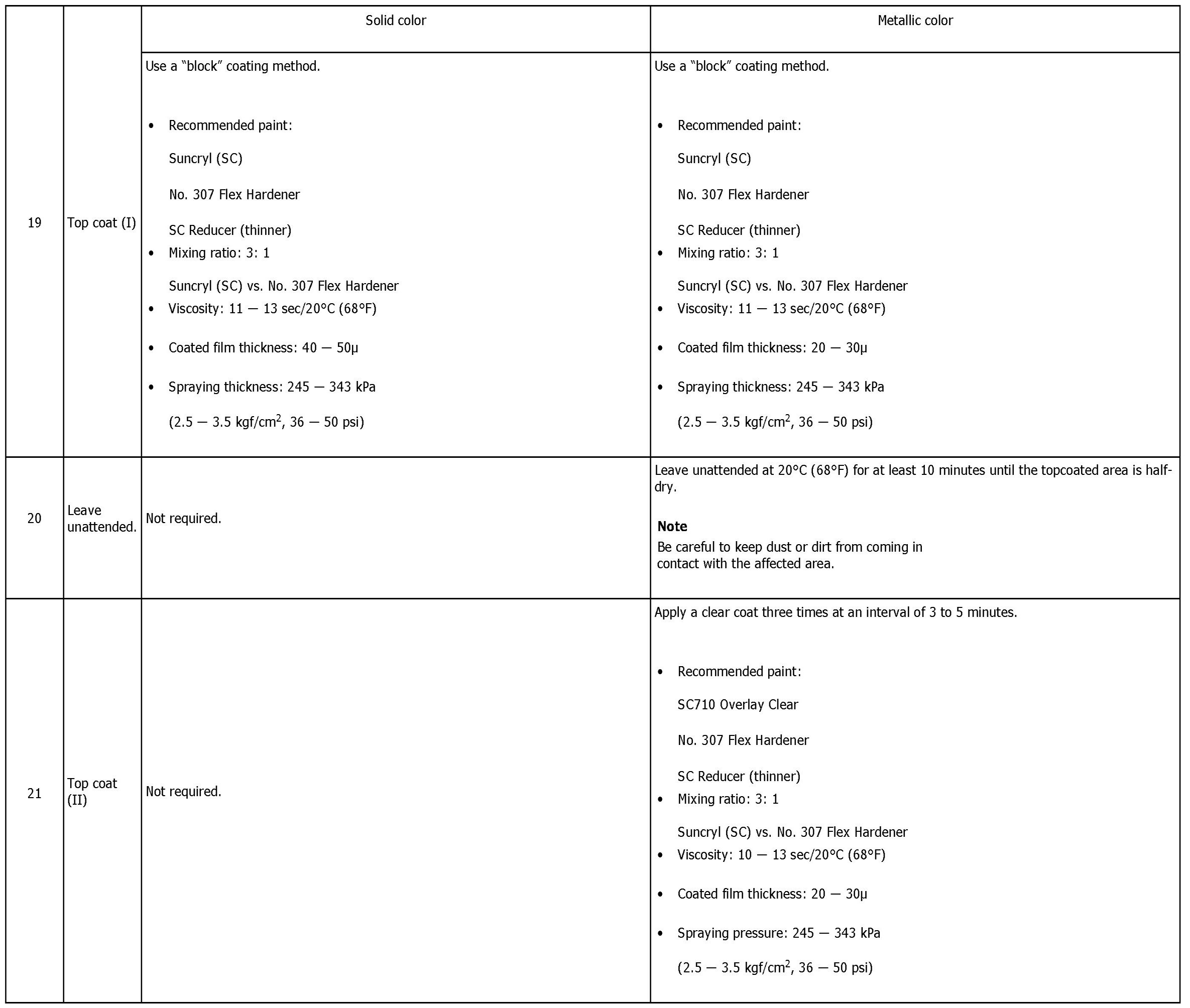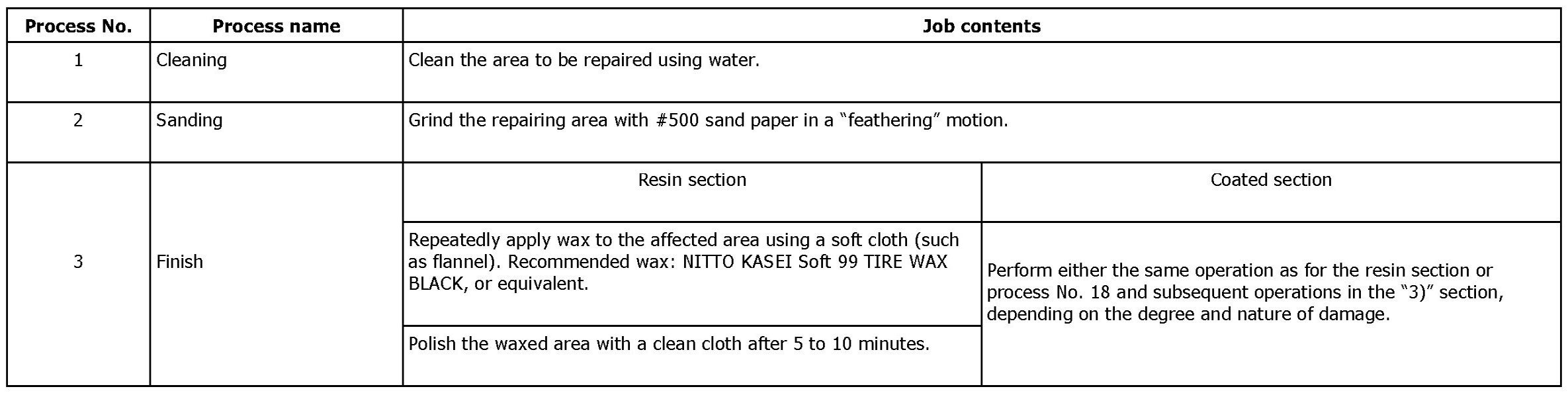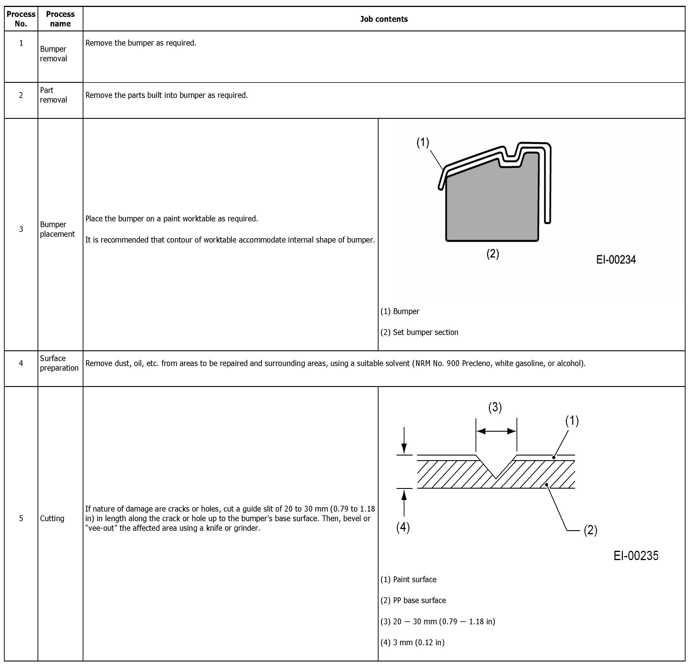 NOTE: All PP bumpers are provided with a grained surface, and if the surface is damaged, it cannot normally be restored to its former condition. Damage limited to shallow scratches that cause only a change in the lustre of the base material or coating, can be almost fully restored. Before repairing a damaged area, explain this point to the customer and get an understanding about the matter. Repair methods are outlined below, based on a classification of the extent of damage.