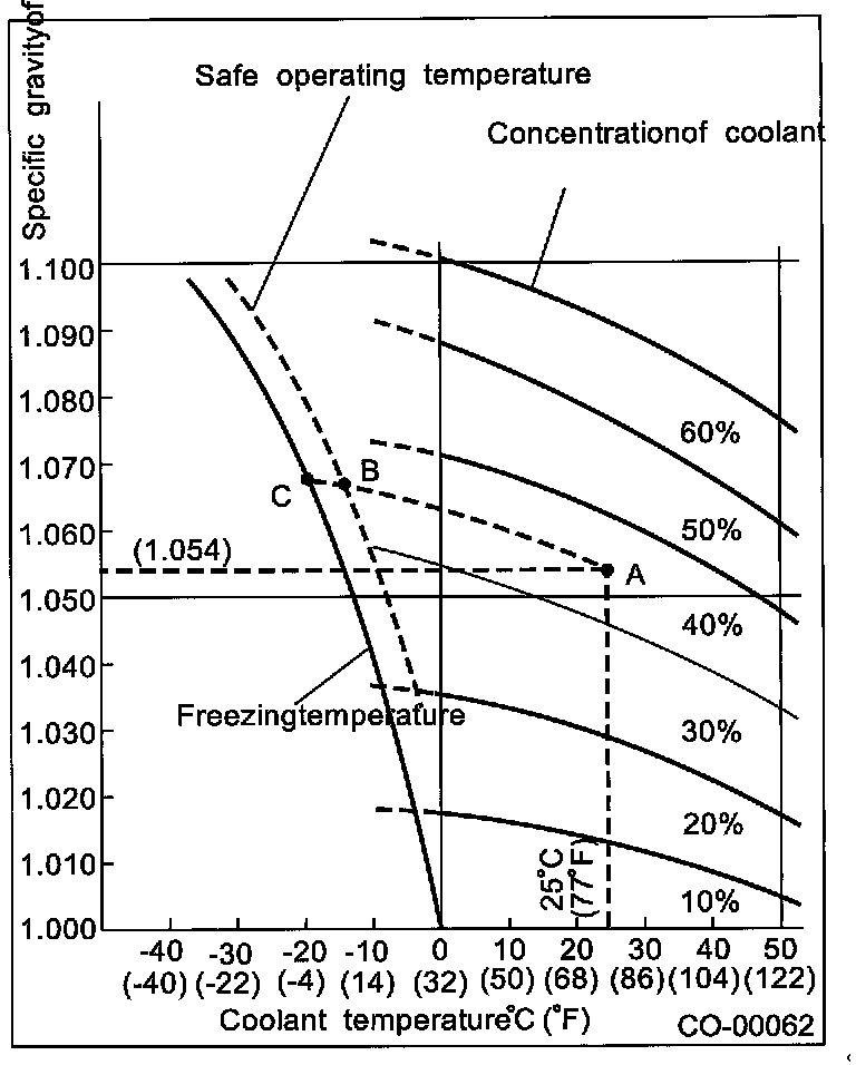 ^ If the coolant temperature is 25°C (77°F) and its specific gravity is 1.054, the concentration is 45% (point A), the safe operating temperature is -14°C (7°F) (point B), and the freezing temperature is -20°C (-4°F) (point C).
