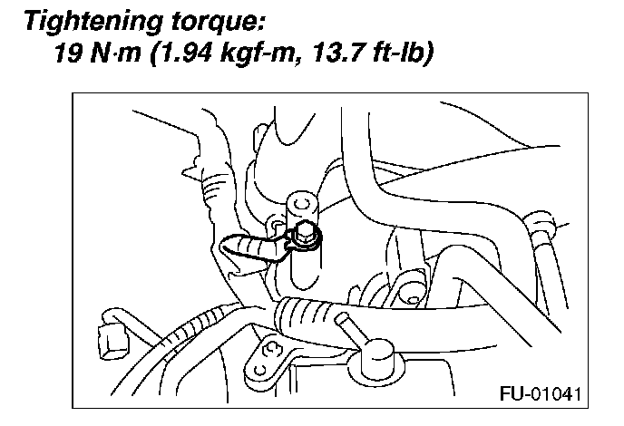 12. Tighten the two bolts which install the fuel injector pipes on the left side of intake manifold.