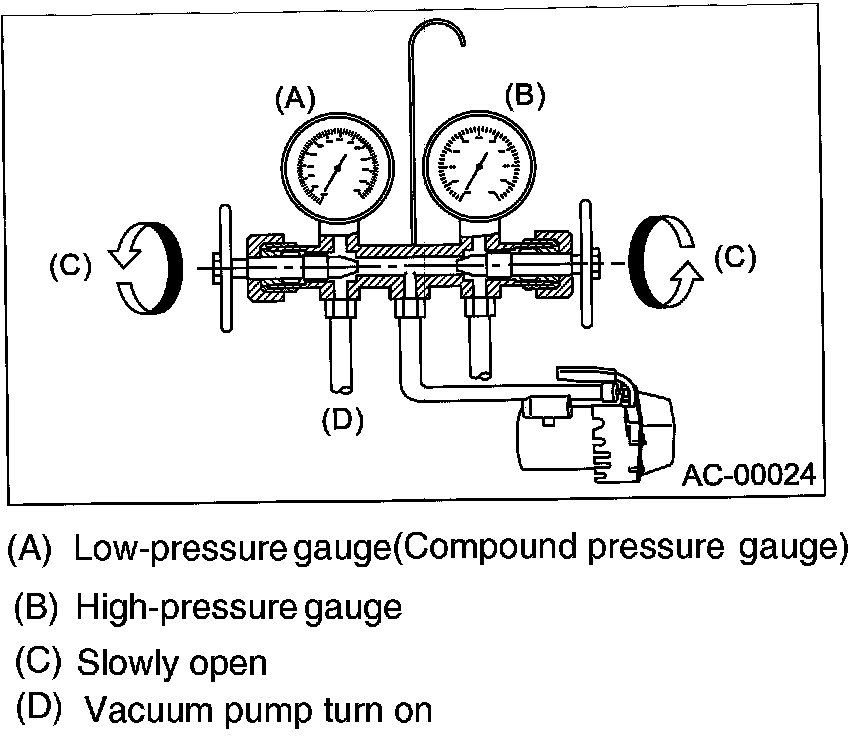 Carefully open the valves on the low-/high-pressure sides to activate the vacuum pump.