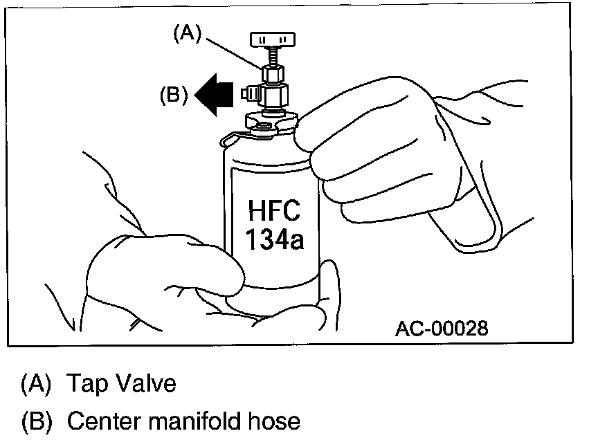Loosen the center hose connection on the manifold gauge set (if applicable, press a purge valve on the manifold gauge set) only for a couple of seconds to allow the air in the center hose to escape by the refrigerant.
