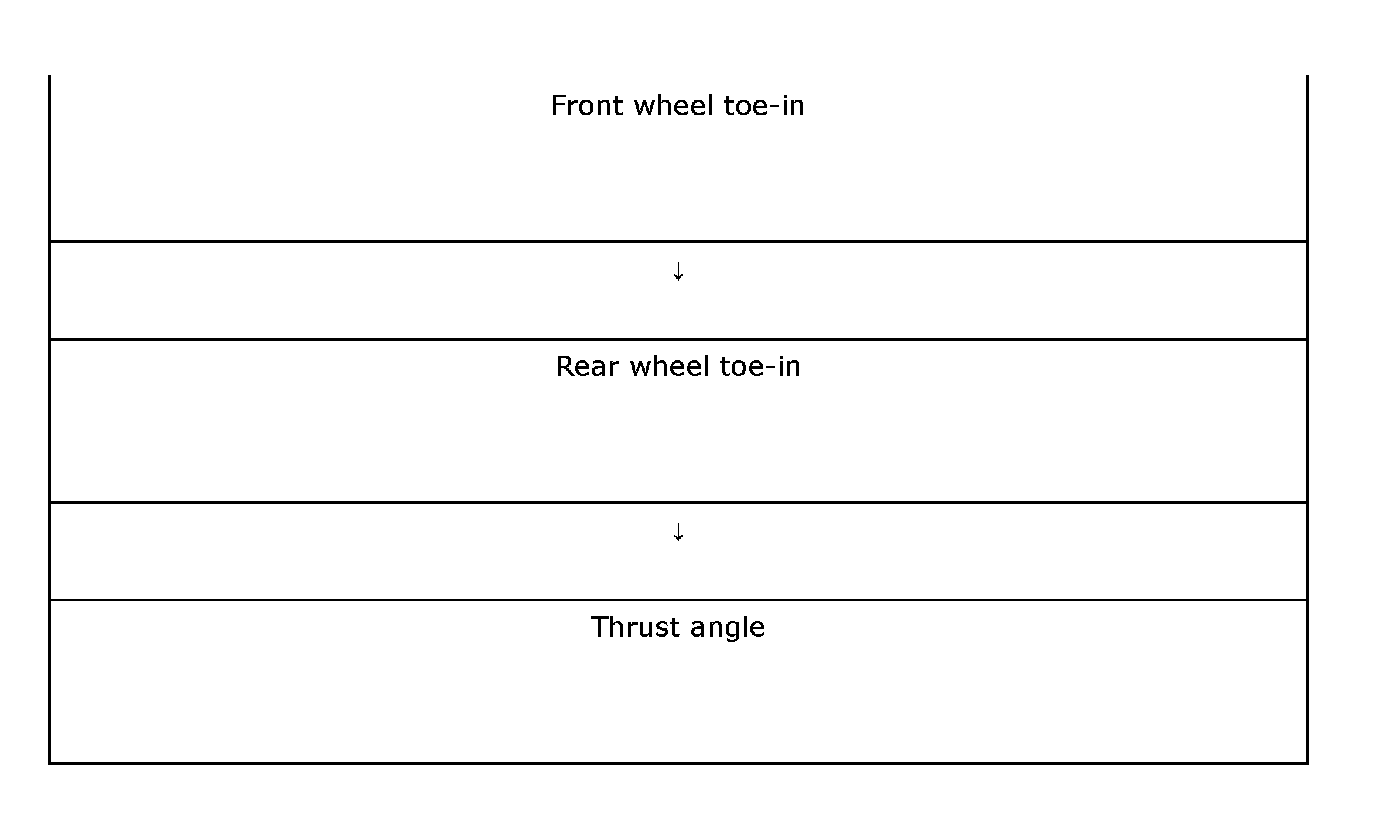 When one rear wheel is adjusted in a toe-in direction, adjust the other rear wheel equally in toe-out direction, in order to make thrust angle adjustment.