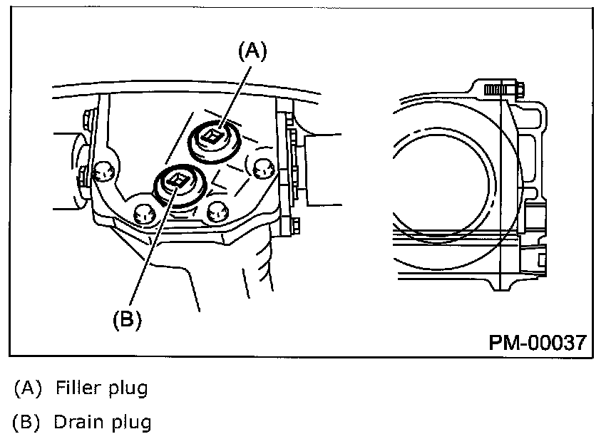 ^ After installing the drain plug onto rear differential gear case firmly, fill oil up fully to the mouth of filler plug.