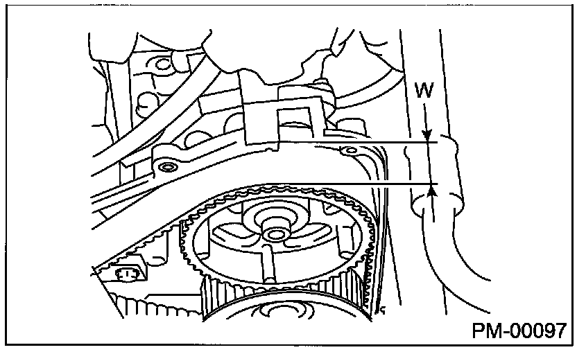 3. Measure the timing belt width W. If it is less than 30 mm (1.18 in), check idlers, tensioner, water pump pulley and cam sprocket to determine idler alignment (squareness). Replace the worn timing belt.