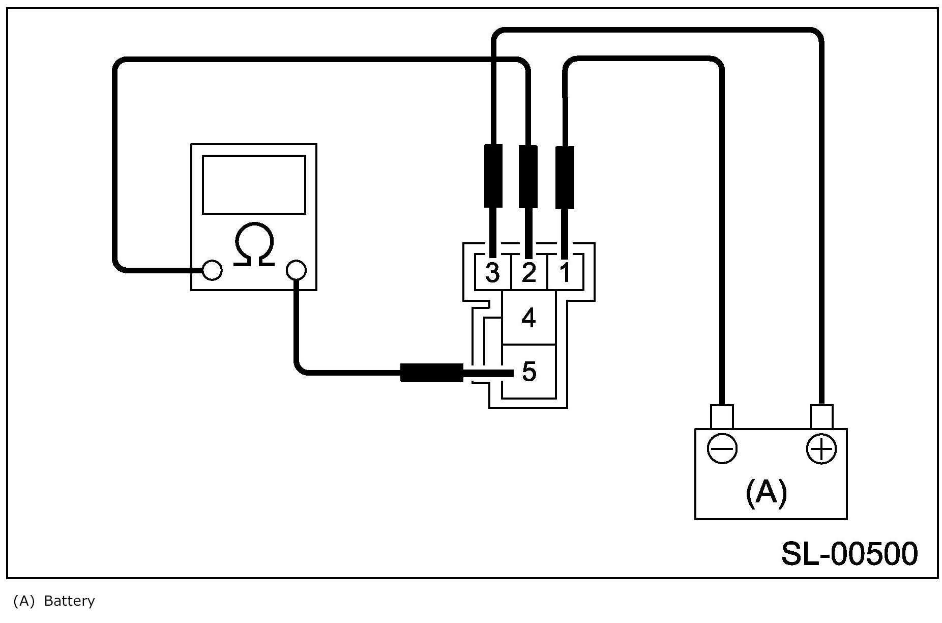 Measure the interrupt relay resistance between terminals (indicated in the table below) when connecting terminal No.3 to battery positive terminal and terminal No.1 to battery ground terminal.