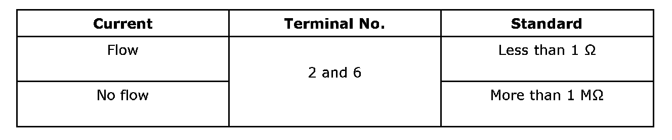 Measure the interrupt relay resistance between terminals (indicated in the table) when connecting terminal No. 4 to battery positive terminal and terminal No. 1 to battery ground terminal.