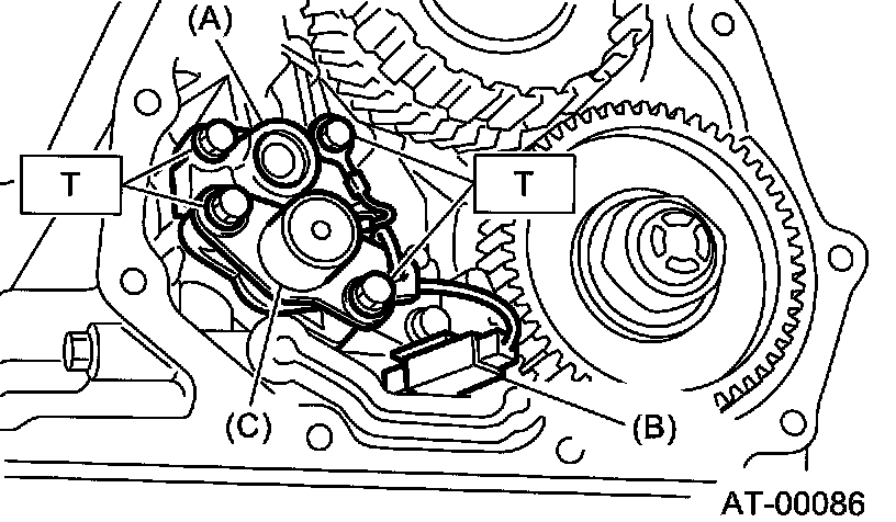 Install the transfer duty solenoid and transfer valve body. Install the transfer duty solenoid and transfer valve body. Tightening torque: T6: 8 Nm (0.8 kgf-m, 5.8 ft. lbs.) Connect the transfer duty solenoid connector.