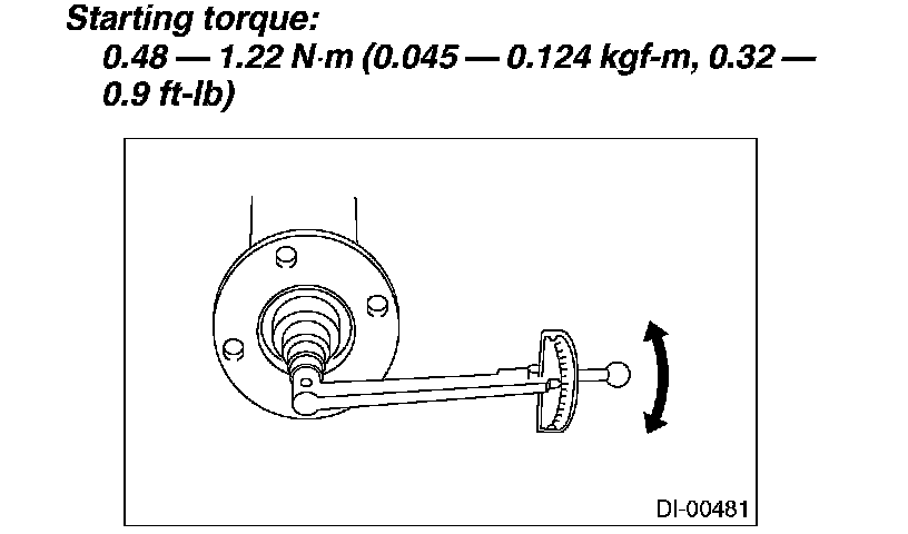 (7) At the same time, measure the total preload of drive pinion. Compared with the resistance when differential case is not installed, if the total preload is not within specification, adjust the thickness of side bearing retainer shims, increasing/reducing by an even amount at a time.