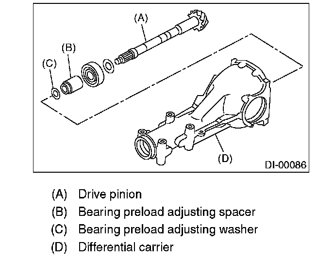 Adjust the bearing preload with spacer and washer between front and rear bearings. Pinion height adjusting washer are not affected by this adjustment. The adjustment must be carried out without oil seal inserted.