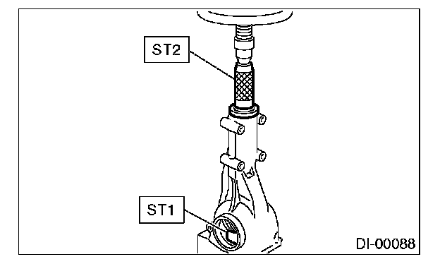6. Insert the spacer, then press-fit the pilot bearing with ST1 and ST2.