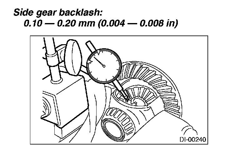 If the backlash exceeds 0.20 mm (0.008 inch), reduce the thickness of shim on the back face of hypoid driven gear and increase the thickness of shim on the tooth face of hypoid driven gear. If the backlash is less than 0. 10 mm (0.004 inch), increase the thickness of shim on the back face of hypoid driven gear and reduce the thickness of shim on the tooth face of hypoid driven gear.