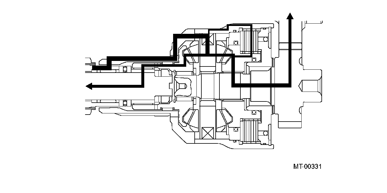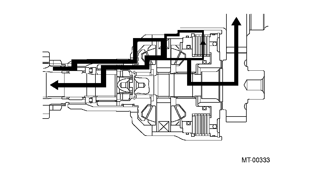 FUNCTIONWhen there is no speed difference between the front and rear wheels, the center differential delivers the engine torque to the front and rear wheels at a ratio of 50:50.