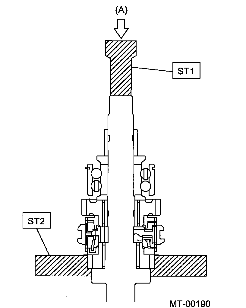 Using the ST1 and ST2, install the 5th gear thrust washer and 5th needle bearing race onto the rear section of transmission main shaft.