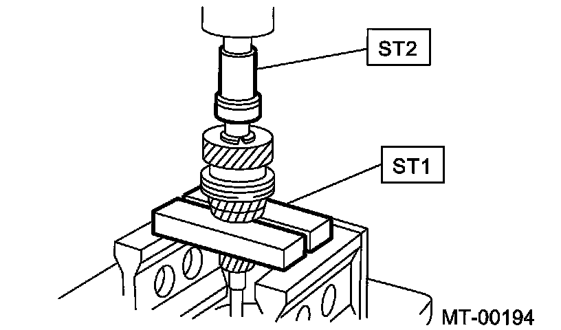 Drive the ball bearing onto the rear section of transmission main shaft using ST1, ST2 and a press.