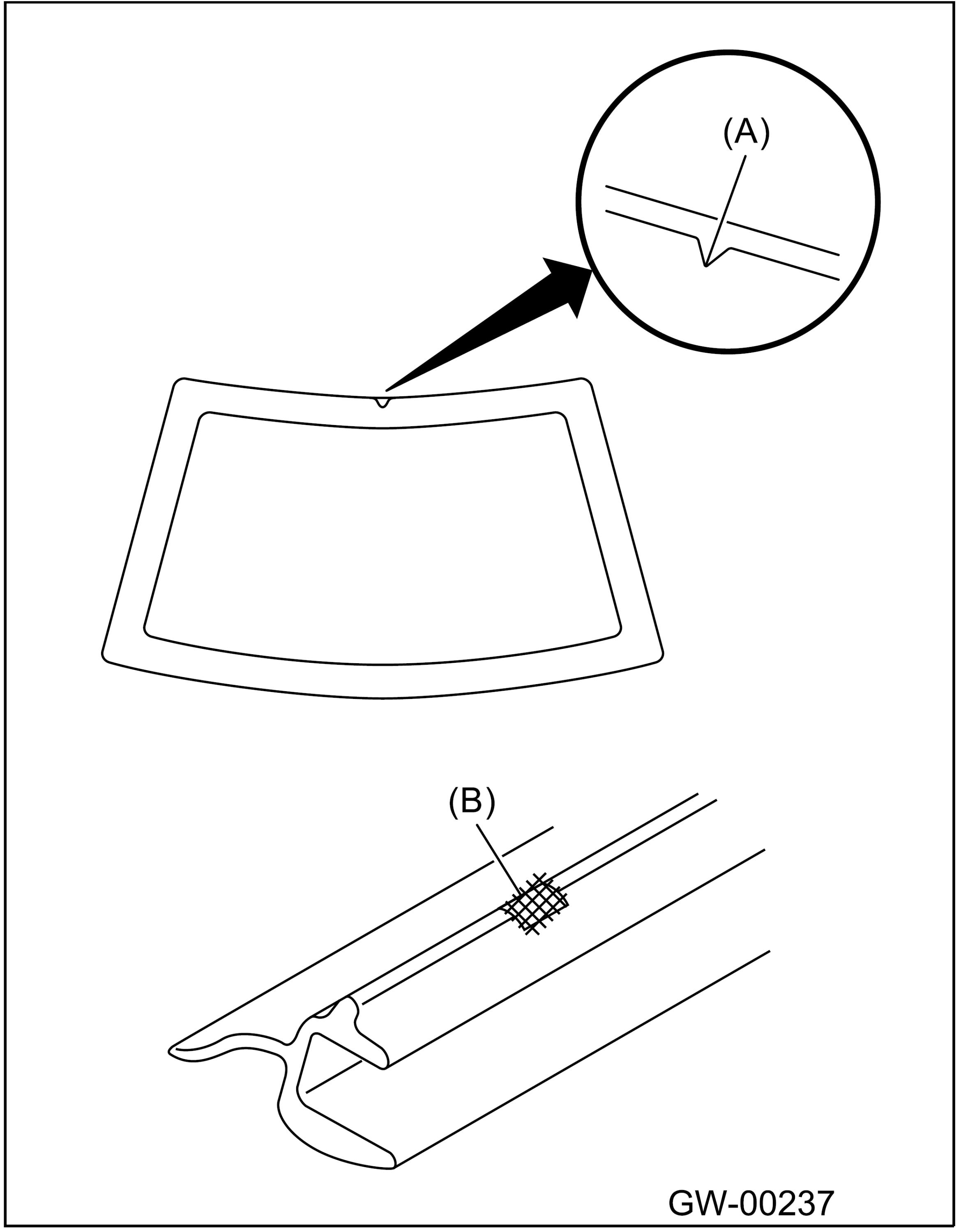 Fit the mark (B) on molding to the notch (A) of glass side, and install the molding to the whole glass edge.
