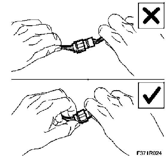 ^ Insert the test cable pin into the connector pin to feel the clamping force of the pins in question. Poor clamping force of the connector pins can cause bad contact.