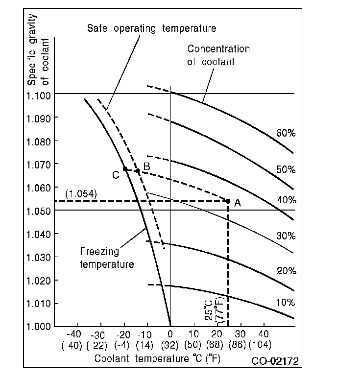 ^ If the coolant temperature is 25°C (77°F) and its specific gravity is 1.054 and the concentration is 35% (point A), the safe operating temperature is -14°C (7°F) (point B), and the freezing temperature is -20°C (-4°F) (point C).