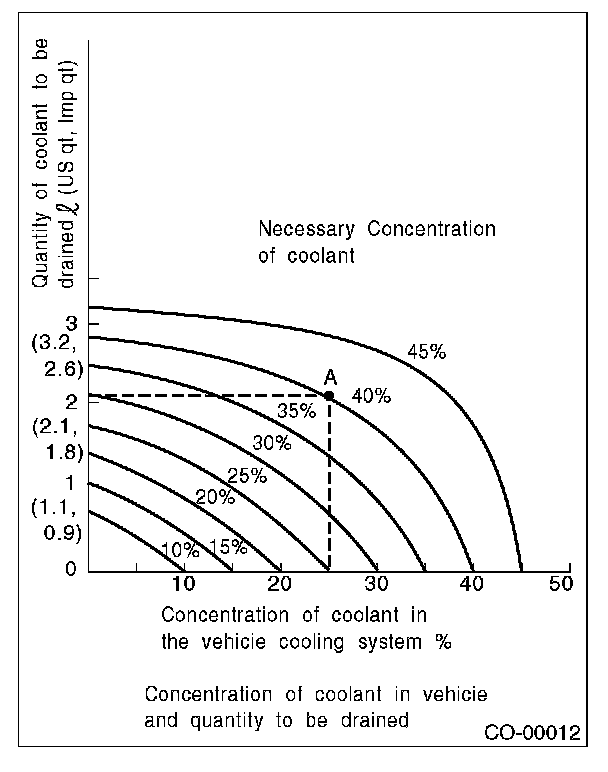 ^ Assume that the coolant concentration must be increased from 25% to 40%. Find point A, where the 25% line of coolant concentration intersects with the 40% curve of the necessary coolant concentration, and read the scale on the vertical axis of the graph at height A. The quantity of coolant to be drained is 2.1 l (2.2 US qt, 1.8 Imp qt). Drain 2.1 l (2.2 US qt, 1.8 Imp qt) of coolant from the cooling system and add 2.1 l (2.2 US qt, 1.8 Imp qt) of the undiluted solution of SUBARU coolant.