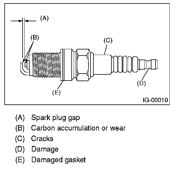 Check the electrodes and inner and outer ceramic insulator of plugs, noting the type of deposits and the degrees of electrode erosion.