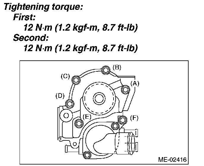 When installing the water pump, tighten bolts in two stages in alphabetical sequence as shown in the figure.