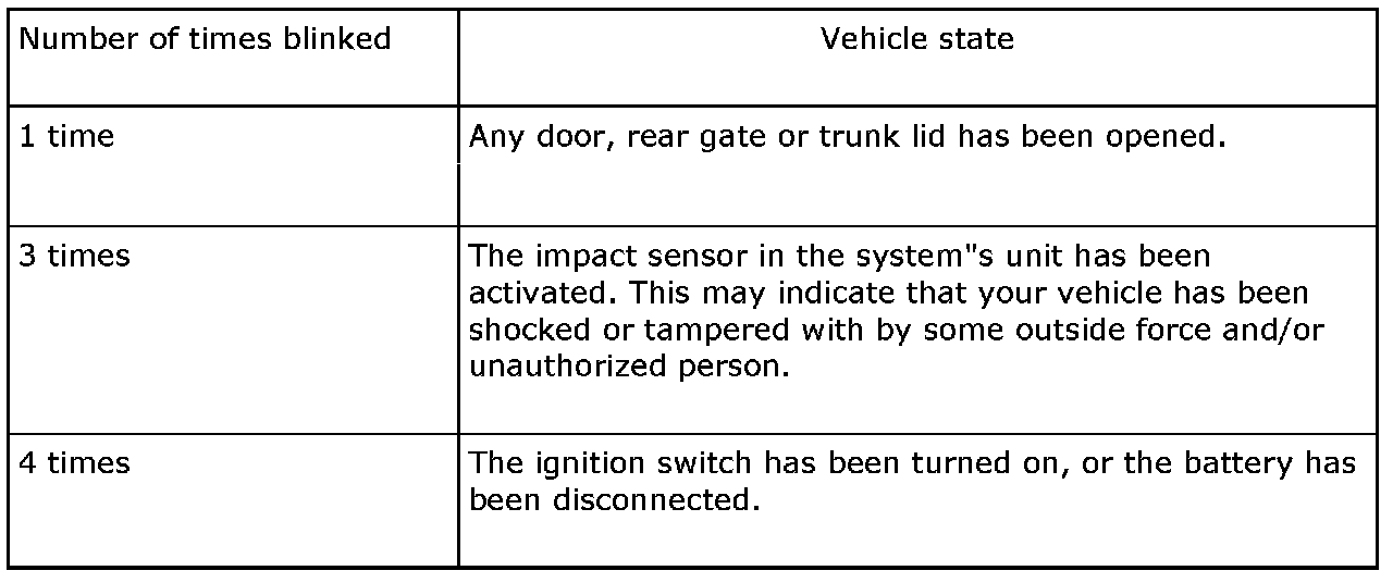 If an electronic chirp sounds four times and the turn signal lights blink four times when you disarm the system, this indicates that the alarm was triggered. The number of times the indicator light blanks indicates what sensor caused the alarm condition.