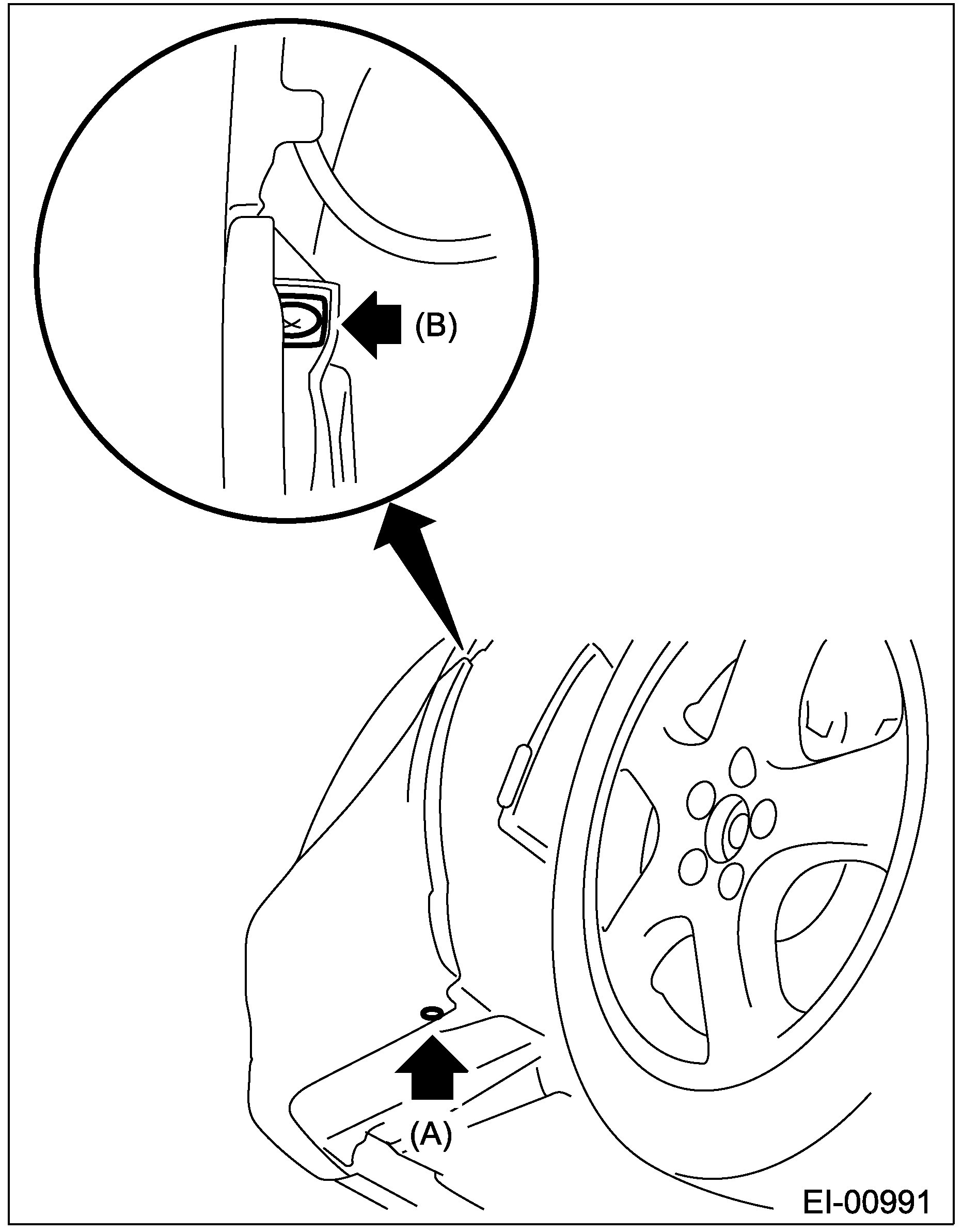Turn over the mud guard, and then remove the clips (A) and screw (B), which clip the front bumper to fender.
