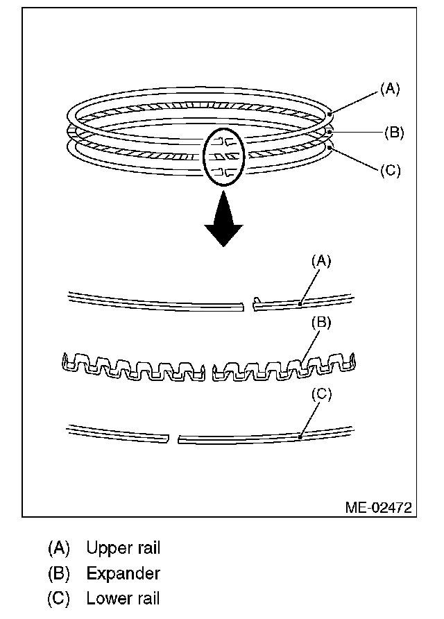 ^ Oil ring consists of the upper rail, expander and lower rail. Be careful about the direction of rail when installing the oil ring to piston.