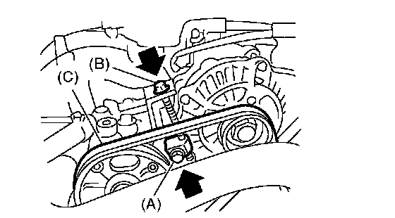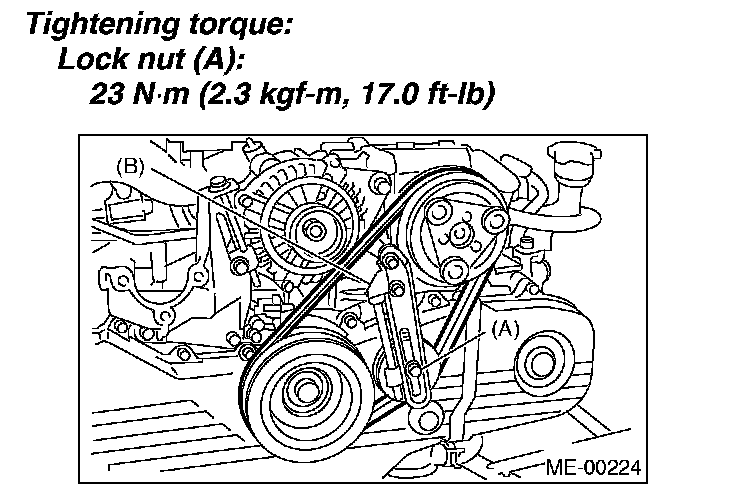 2. Install a V belt, and tighten the slider bolt (B) so as to obtain the specified belt tension.