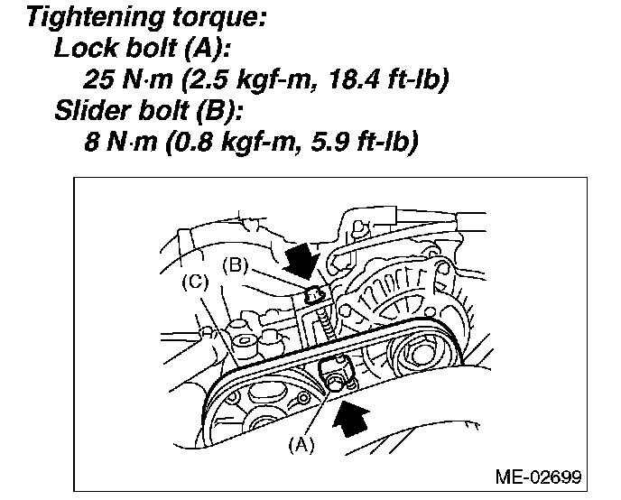 1. Install a V belt (c), and tighten the slider bolt so as to obtain the specified belt tension.