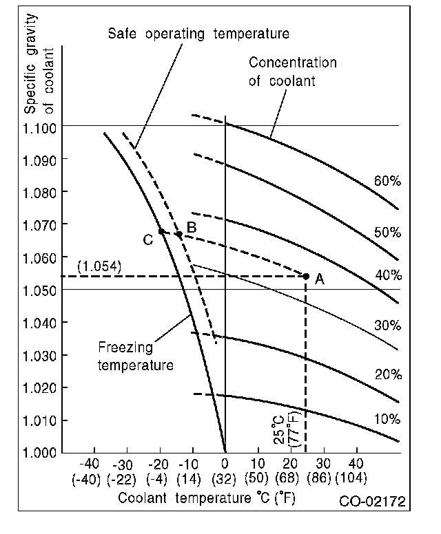 ^ If the coolant temperature is 25°C (77°F) and its specific gravity is 1.054 and the concentration is 35% (point A), the safe operating temperature is -14°C (7°F) (point B), and the freezing temperature is -20°C (-4°F) (point C).