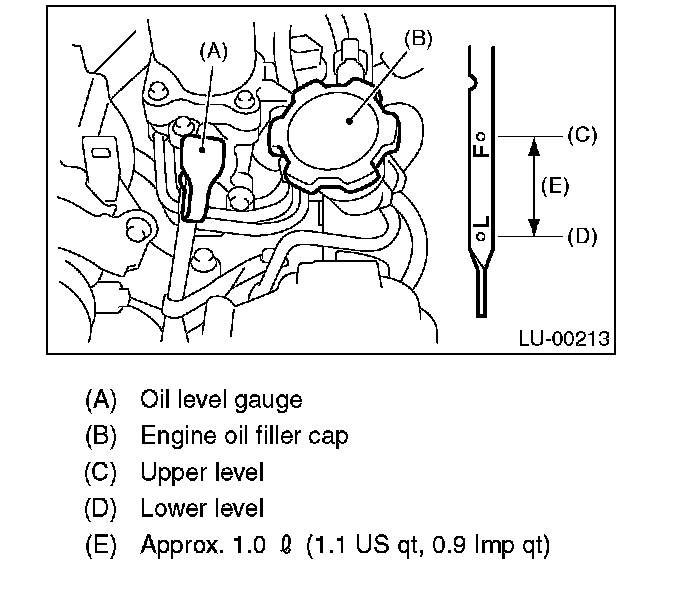 CAUTION: When replenishing oil, it does not matter if the oil to be added is a different brand from that in the engine; however, use oil having the API standard and SAE viscosity No. designated by SUBARU.