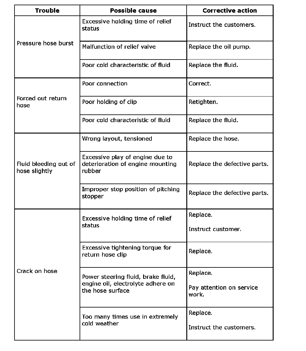 Since the resistances for heat or low temperature brittleness are gradually declining according to time accumulation of hot or cold conditions for the hoses and their service lives are shortening accordingly, it is necessary to perform the careful inspection frequently when the vehicle is used in hot weather areas, cold weather area and a driving condition in which many steering operations are required in short time.