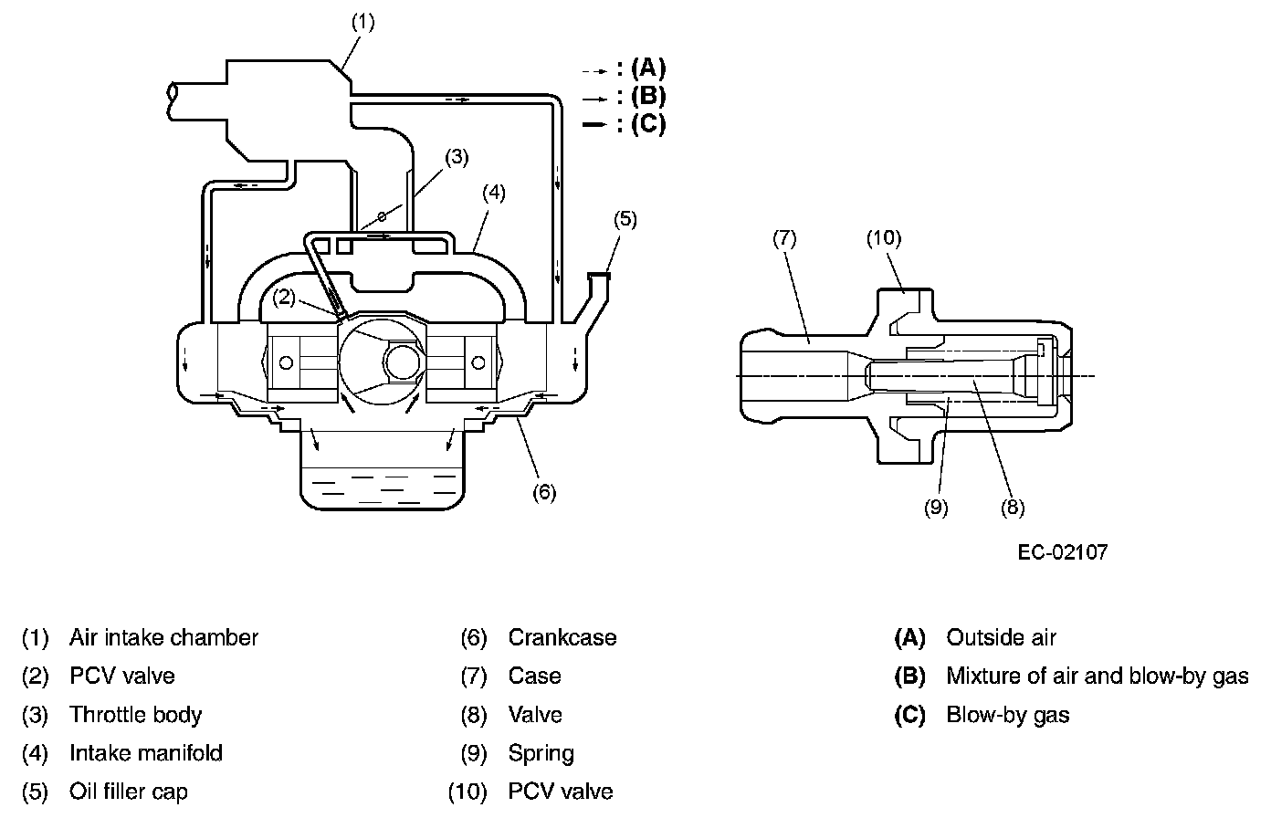 ^ In a part-throttle condition, the blow-by gas in the crankcase flows into the intake manifold through the connecting hose of crankcase and PCV valve by the strong vacuum created in the intake manifold. Under this condition, fresh air is introduced into the crankcase through the connecting hose of the rocker cover.
