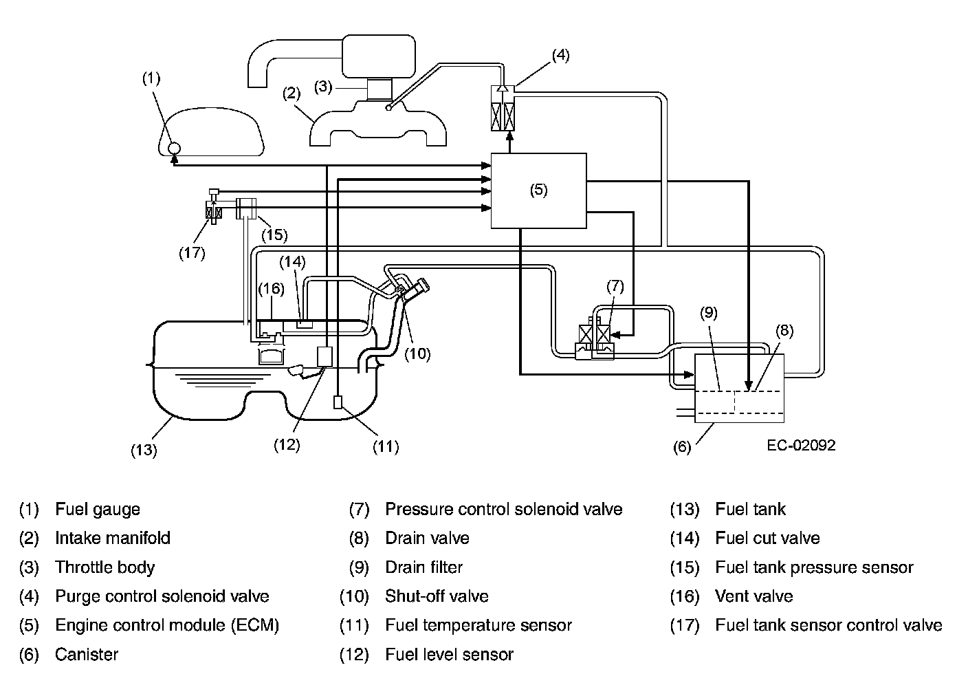^ The pressure control solenoid valve incorporated in the fuel tank evaporation line regulates the pressure/vacuum in the fuel tank under the control of the ECM which uses the signal from the fuel tank pressure sensor.