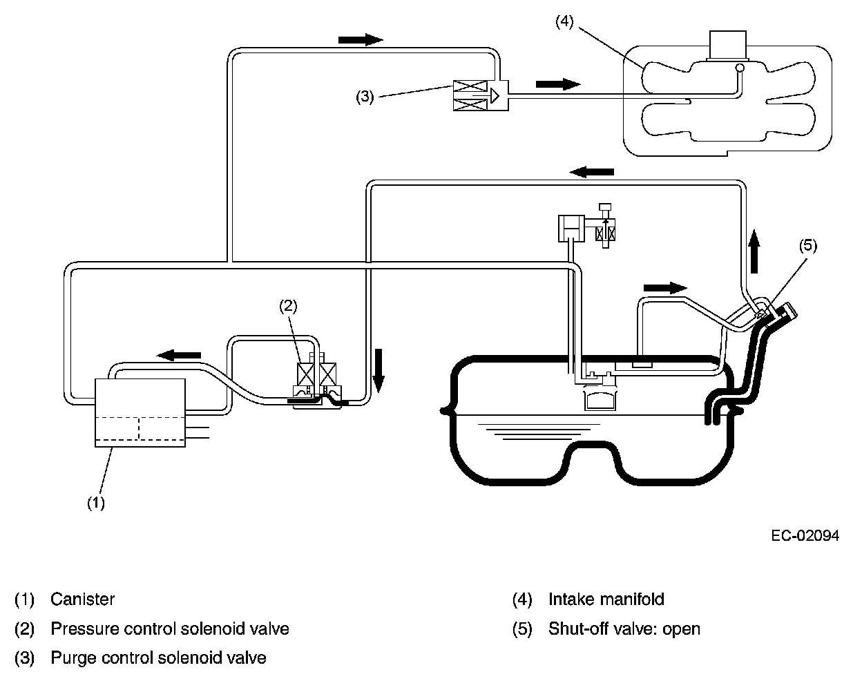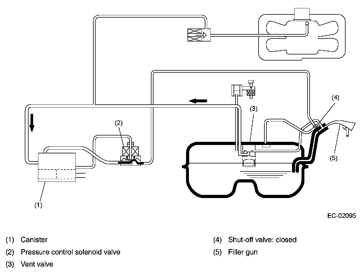 As the fuel enters the fuel tank, the tank inside pressure increases. When the inside pressure becomes higher than the atmospheric pressure, the port of the vent valve opens, allowing the fuel vapors to be introduced into the canister through the vent line. The fuel vapors are absorbed by charcoal in the canister, so the air discharged from the drain valve contains no fuel. When a filler gun is inserted, the shut-off valve closes the evaporation line.