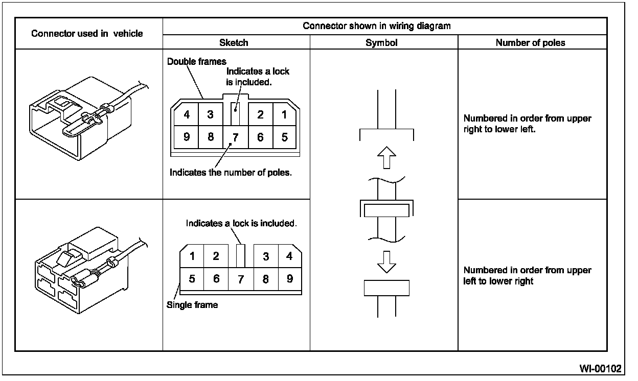 ^ The number of poles or pins, presence of a lock are indicated in the sketch of each connector. In the sketch, the highest pole number refers to the number of poles which connector has. For example, the sketch of connector shown in the figure indicates the connector has 9 poles.