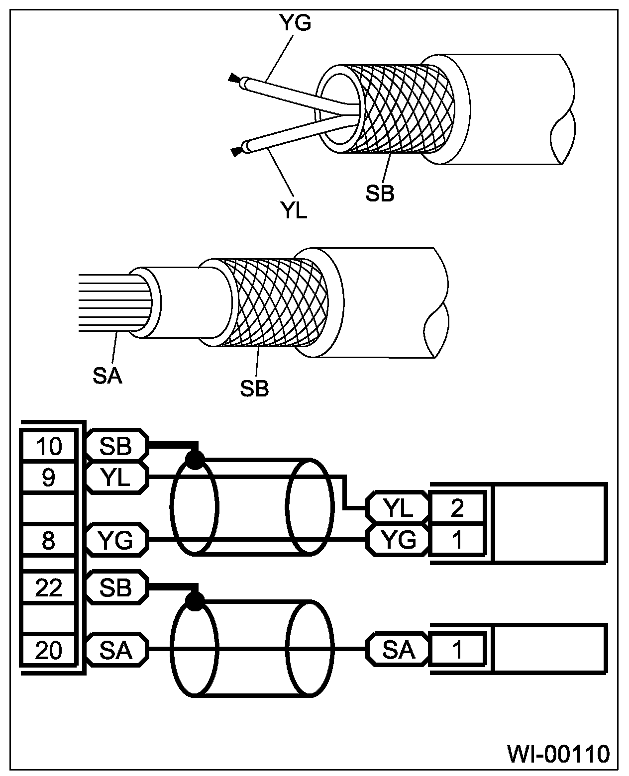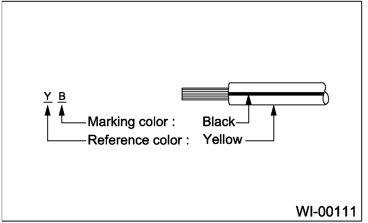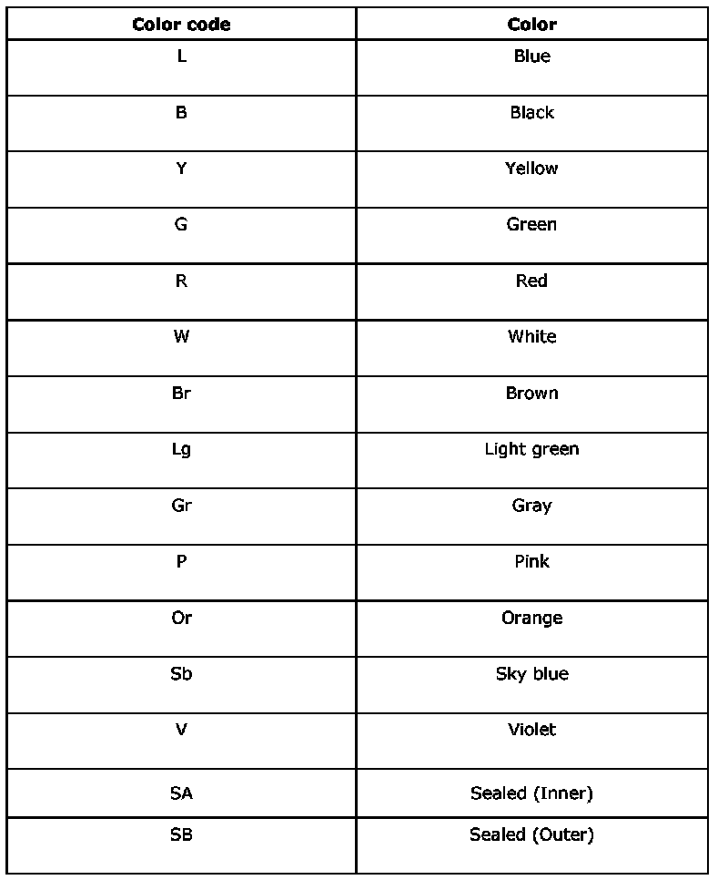 ^ The wire color code, which consists of two letters (or three letters including Br or Lg), indicates the standard color (base color of the wire covering) by its first letter and stripe marking by its second letter.