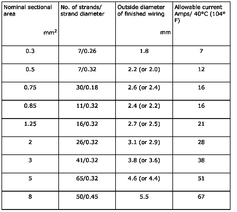 ^ The allowable current in the table indicates tolerable amperage of each wire at an ambient temperature of 40 degrees C (104 degrees F).