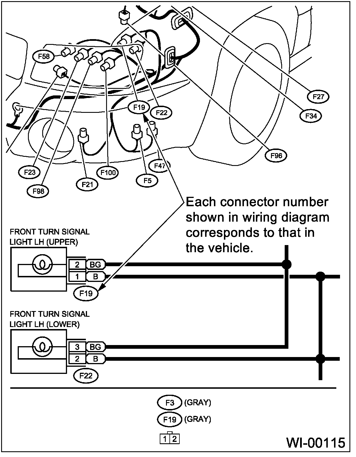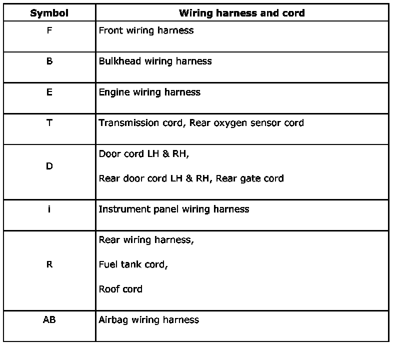 ^ Each connector number shown in the wiring diagram corresponds to that in wiring harness. The location of each connector in actual vehicle is determined by reading the first character of the connector (for example, a "F" for "F8", "i" for "i16", etc.) and type of wiring harness. The first character of each connector number refers to the area or system of the vehicle.