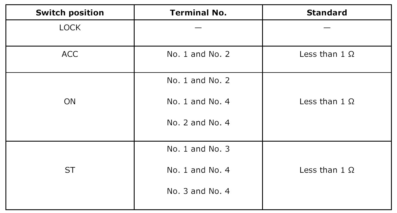 Turn the ignition key plate to each position and check the continuity between terminals of ignition connector.