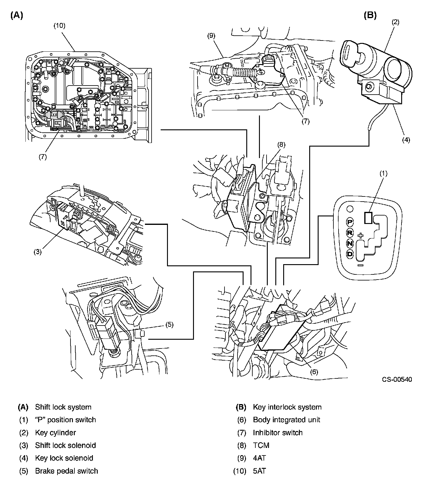 GENERALTo increase safety during standing start, the shift lock system prevents movement of the select lever from the "P" position to any other position unless the brake pedal is depressed. This system is also provided with a key interlock function which prevents removal of the ignition key from the key cylinder unless the selector lever is placed in the "P" position.