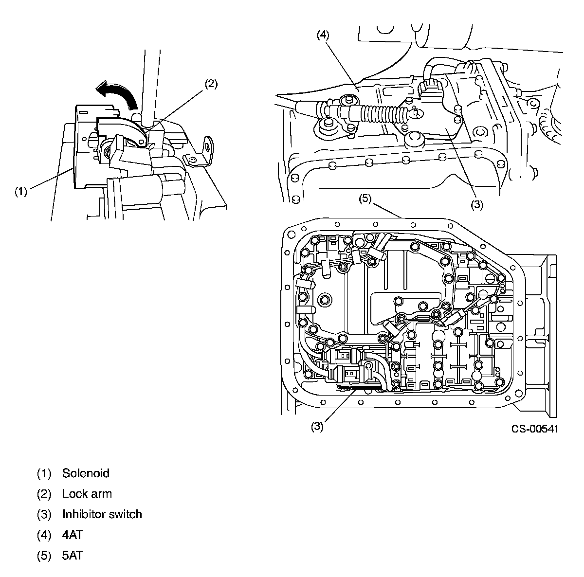 SHIFT LOCK SYSTEM OPERATIONThe shift lock system has a solenoid-operated plunger (1). With the select lever in the P position, the plunger remains extended, holding the lock arm (2) in its pushed out (locking) position. When the brake pedal is depressed with the ignition switch in either the ON or START position, the solenoid is energized and the plunger is retracted. This causes the lock arm to lift to the select lever release position. The select lever now can be moved to any other position. The P position of the select lever is detected by the inhibitor switch (3).