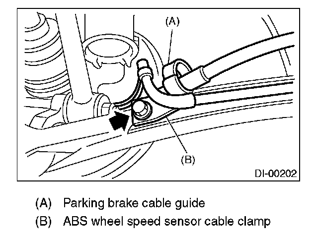 (1) Remove the ABS wheel speed sensor cable clamp and parking brake cable clamp from bracket.