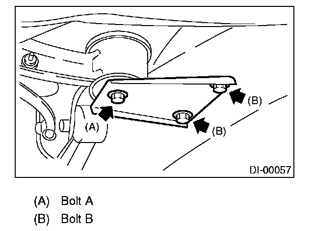 18. Remove the bolts which secure the front differential member to body. Loosen the bolt A first, then remove the bolts B.