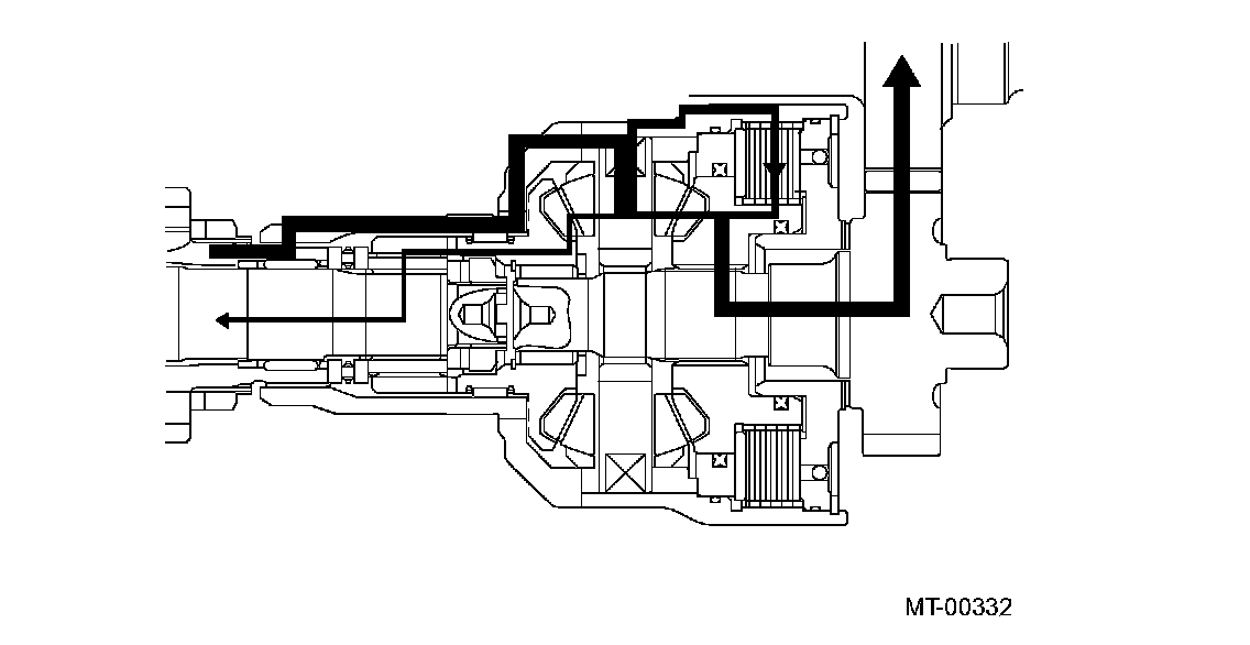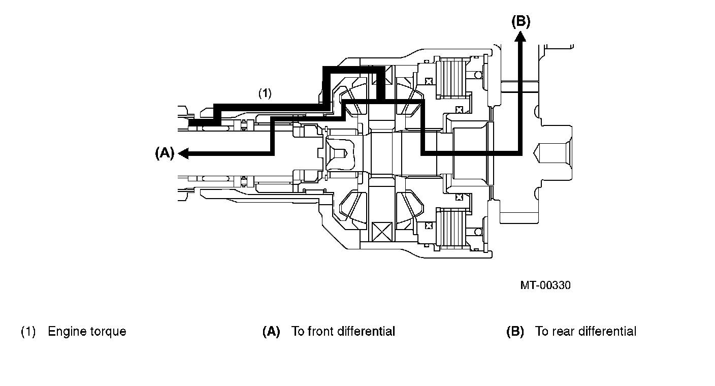 FUNCTIONWhen there is no speed difference between the front and rear wheels, the center differential delivers the engine torque to the front and rear wheels at a ratio of 50:50.